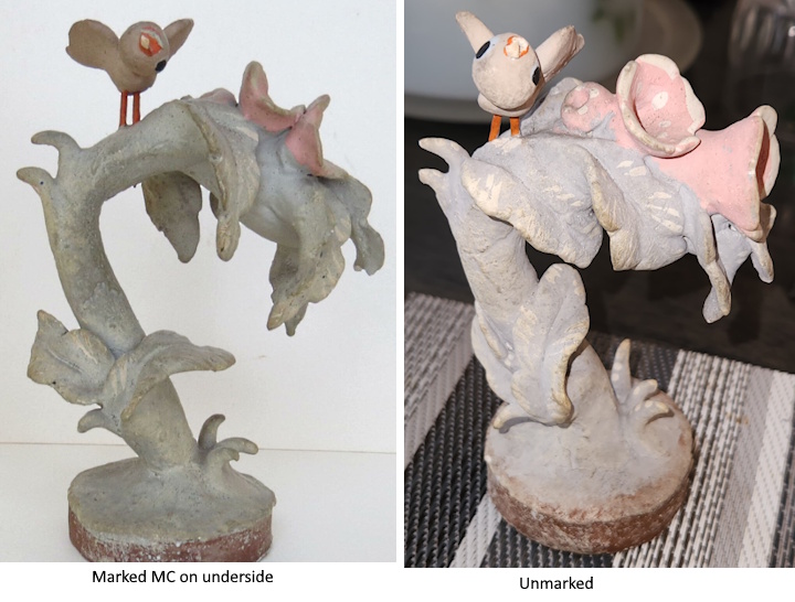 These two small birds, both cast from the same mold but painted differently, are about 3″ high. Although I’ve not been able to identify them by name, the dark-colored one — possibly meant as a baby swift or swallow? — has the design # 325 penciled on the bottom. That 3- series of design numbers is the one Cybis used for all their birds. The closest name/number matchup is the Bluebird ‘By the Garden Wall’ which was #329 in 1952 so it’s likely that this bird mold dates from that year or the one preceding. This was probably a commercial mold.