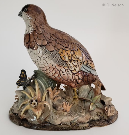 Valley Quail may have been made in both a male and female version; this one appears to be a female. The December 1, 1957 issue of the local Town Topics (Princeton) newspaper contained this snippet: “This shop [Princeton Decorating Shop] at 35 Palmer Square also has some more conventional pieces of pottery and sculpture. B. Cybis has done a porcelain quail six inches high that looks real enough to shoot at.” The fact that this piece is 7.25” high is what makes me wonder if there was a male piece as well.