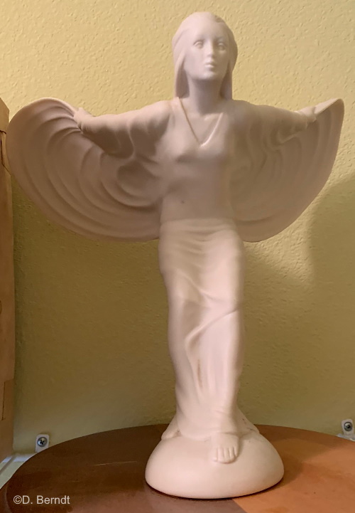 Many thanks to Mr. Berndt for supplying these photos of the Ispanky piece. The top photo is the plaster model (with a repaired wing/arm; an inevitability, because his design made it fatally top-heavy) and the lower one is the same piece in white bisque. There was also a color model (blue dress, blonde hair) which was, after it was determined that the Ispanky version would not be used, sold to a retail jeweler.