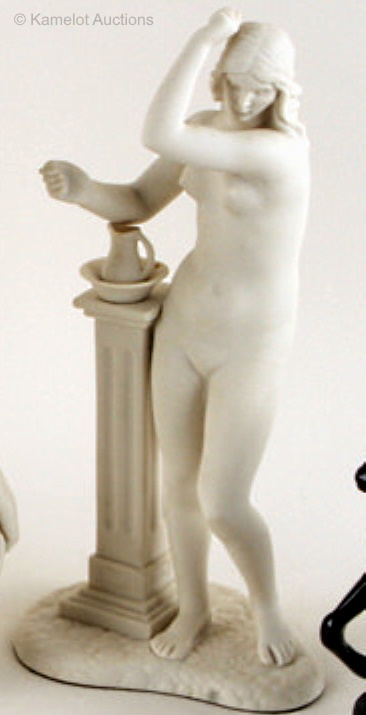 This is a piece that may have also originally been intended for the Classical Impressions series but it was never released. Logic dictates that it should be dubbed Nude with Plinth. The plinth mold is the same that was used for Beau Brummel, but with the column re-worked so that it has fluting instead of scrolls, shells and foliage. At least here we have a copyright year: 1997. This is not on Cybis’ Fall 1997 or May 1999 retail price lists, nor do I ever remember seeing it on their web site (which was not updated after 2008 and disappeared entirely in late 2018.) It is possible that it may have made a very brief appearance during 1998, or in the studio’s early-2000s eBay storefront. The piece shown above was among those in their 2019 liquidation sale.