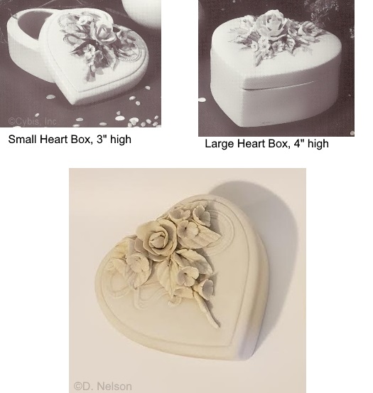 After the Thinking of You hearts were all retired, there were no heart boxes in the Cybis lineup until Spring 1987 when they introduced the Romance Heart Box with Flowers (upper photo) and its wedding-theme variant, the Romance Heart Box with Rings. Both were priced at $225 initially. During the 1990s the “wedding box” disappeared and only the “with flowers” one remained available. This heart box is 2.5” high and about 5” wide.