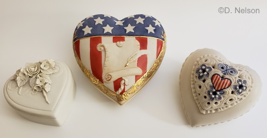 Here’s an excellent visual comparison of the relative sizes of three of the four Cybis heart boxes: the 1950s Small Heart Box, 1987 Stars & Stripes, and mid-1970s Thinking of You which is actually the ‘tallest’ at 3″ high because of the very domed lid.