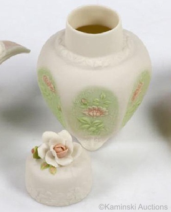 Cybis first offered a covered jar during the 1970s. The Rose Jar was made for three years, 1975–1977, in white bisque for $75 and in color for $95. It is 5” high overall. As the third picture shows, there was some variation in the color version; this one has a green background on the panels, and a white rose on the lid.