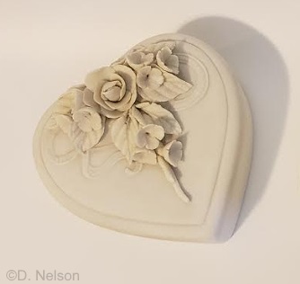 This photo of a white bisque Heart Box shows the handmade floral and ribbon detail clearly.