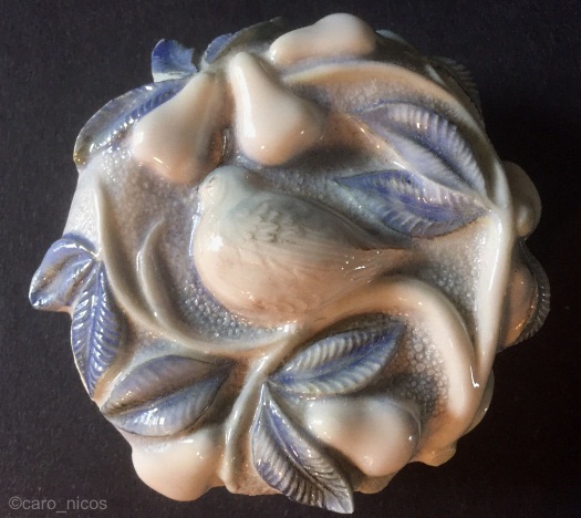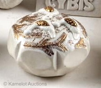 Is this golden/beige version the one described as Ivory by Cybis? If so, it was only made during 1975. The third photo shows the underside of the lid, which was the same (plain white bisque) regardless of a box’s exterior colorway.