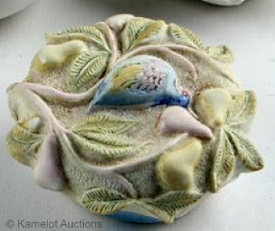 The first image is the same 1950s Powder Box with bird that is shown in the center of the previous photo; these were signed Cybis. The second photo is an earlier Cordey signed round box with bird for style comparison. The Cordey box is much larger, however: 7” in diameter and 6” tall including the decorated lid. The bird itself is slightly more than 2” high and 3.5” long beak to tail.