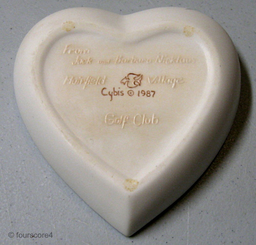 The 1987 Stars and Stripes Heart Box is often misnamed the “Bicentennial” heart by online sellers even though it has a copyright year of 1987 (rather than 1976) in the mold. This has the same dimensions (2”high x 5” wide) as the Romance/Wedding heart box because it is from the same basic mold; only the lid surface sculpt is different. Its issue price was $225. It was retired shortly after introduction and remained so until the 2000s when Cybis made it again available on their website for $495 from back-stock.
