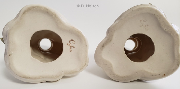 The two mystery 1990s items were indicated only by a title and a design number; no dimensions and no price. One was Candlestick, design #20950; the other was Candle Holder, design #20951. A purist would say (rightly) that the difference between a ‘candlestick’ and a ‘candle holder’ is that the former has a spike in the center of the well, whereas the latter does not. However, no porcelain version would have a central spike because it would immediately break off upon contact with a candle. Yet, Cybis titled their Iris piece as a “stick.” I suspect that they, like most people, probably refer to a tall piece as a candlestick and a short one as a candle holder. This makes it likely that the 1993 items were short and tall versions of the same or similar mold.