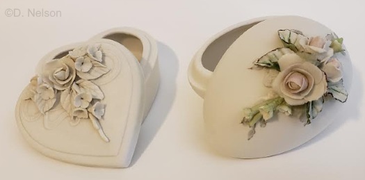 Here are two contemporaneous 1950s boxes side by side: a white bisque Heart Box and the decorated bisque Egg Box.