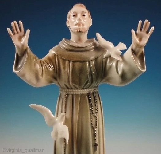 Saint Francis with Doves is 12″ high and 5.5″ wide overall. A dove perches on each shoulder (the darker color on the lower section is a shadow; the piece is ent irely white.) Cybis in Retrospect lists the following colorways: “white, decorated, glazed, decorated.” Retired before 1963.