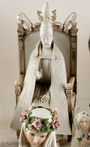 This unfinished Saint Peter that had remained in the Cybis studio’s backstock for more than fifty years was sold during the late 2019 liquidation of their remaining holdings. Although the Cybis literature claimed that the sculpture presented to the Pope was “one of a kind”, clearly the studio had made at least one (perhaps more) extra. Notice that on this piece the right-hand end of the pallium (the long narrow band of fabric atop the robe and with both ends hanging down, as seen in the original piece) is missing/broken off.
