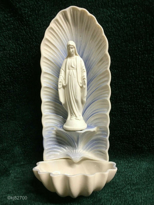 A entirely different design was used for the Holy Water Font ‘Our Lady of Grace’ which is clearly all porcelain. It’s also smaller, being 9″ high overall. The madonna figure itself is about 4.25″ high and was also sold separately as Our Lady of Grace. The white bisque version of this font sold for $10 during the 1950s.