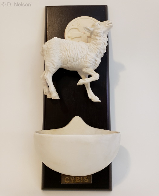 The actual appearance of the Holy Water Font ‘Lamb of God’ came as a surprise because I was expecting it to contain a Jesus figure as a young boy! But this is literally a lamb, and is the same mold that was used in the Pillar of Families nativity group. The lamb is rather precariously attached to the wood plaque by means of a green adhesive. The circular mold is one of the halos that the studio used during this era on some of their religious figures. The CYBIS plaque was probably added by the previous owner.