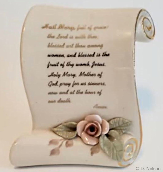 The Prayer Scroll from the same era displays the ‘Hail Mary’ and is more petite at about 4″ high. This one still has its original design number in pencil (226) and is stamped Cybis Fine China in blue.