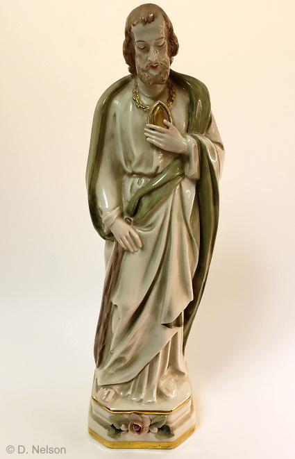 Here is Saint Jude who at 15″ is the tallest Cybis saint discovered thus far. He differs from most representations of this saint in that the medallion around his neck is plain rather than having an image of the face of Jesus on it.