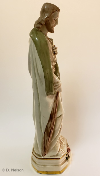 This shows the same Saint Peter after it had been cleaned post-sale. Some of the brown “Cypia” shading may well have been unfired watercolor paint which simply wiped off; undoubtedly some other areas were dirt from the abysmal storage conditions in the Cybis building. However, the pallium is now entirely missing, and his right hand has also been broken off. The pieces that the Museum won at the liquidation auction were not delivered to them for several months after the auction ended, so it’s not known when or how the additional damage happened. [photo courtesy of the Museum of American Porcelain Art]
