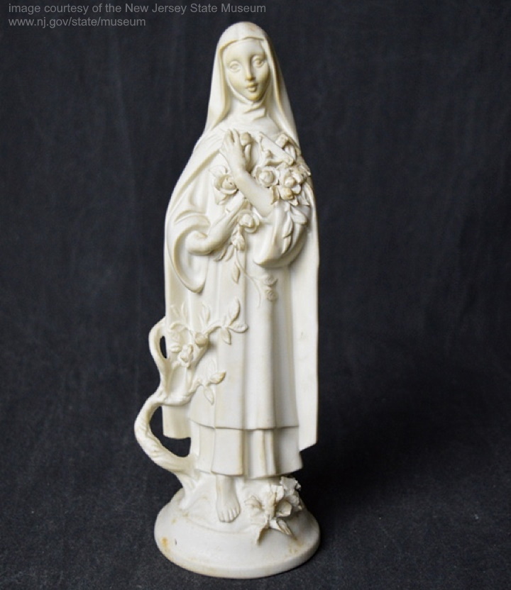 Thanks to the extremely helpful curators of the Cybis collection at the New Jersey State Museum in Trenton, we now know what the white bisque version of Saint Theresa looked like. The big surprise (for me) was that this piece was obviously designed by Harry Burger, who was also responsible for the House of Gold and the Walking Madonna as well as a number of other later Cybis pieces; check out my artist profile of him to see the full list. I have not been able to find a matching Holland Mold Company mold for this, as almost all other 1950s Cybis saints were cast from, and so that may mean that Mr. Burger designed this one directly for Cybis. Either that, or he did it for Holland Molds!