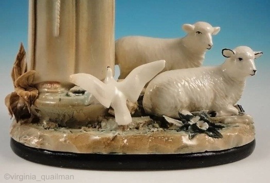 An expanded version of the previous piece is Saint Francis with Doves and Lambs. The use of a larger (7.25″ wide x 3″ deep) base enabled the addition of more wildlife. The doves are also from a different mold. This was their design number 2085.