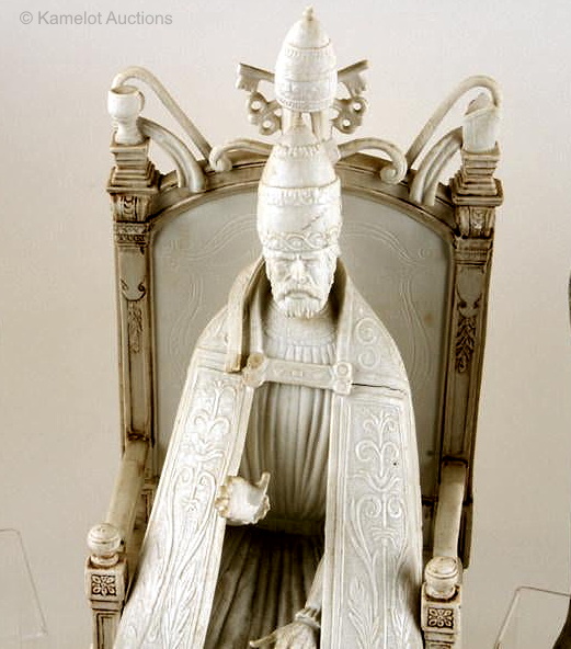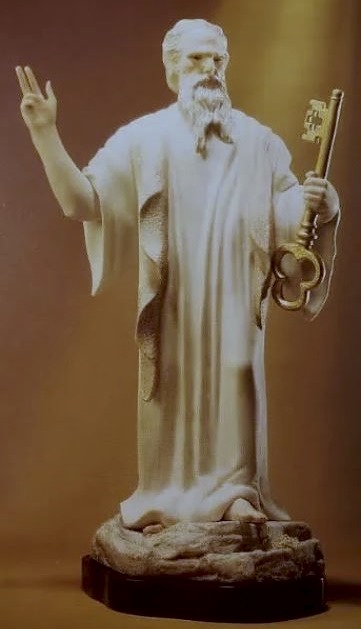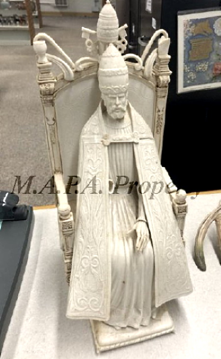 This unfinished Saint Peter that had remained in the Cybis studio’s backstock for more than fifty years was sold during the late 2019 liquidation of their remaining holdings. Although the Cybis literature claimed that the sculpture presented to the Pope was “one of a kind”, clearly the studio had made at least one (perhaps more) extra. Notice that on this piece the right-hand end of the pallium (the long narrow band of fabric atop the robe and with both ends hanging down, as seen in the original piece) is missing/broken off.