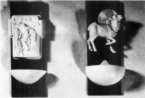 This small plaque, which is only about 5″ tall, was also used by the studio on a crucifix as well as a small plaque by itself. Because this isn’t in the 1978-79 catalog Appendix we don’t know what sold for but it’s safe to assume that it was between $10 and $15, like the others. Here it is shown next to the Lamb of God holy water font.