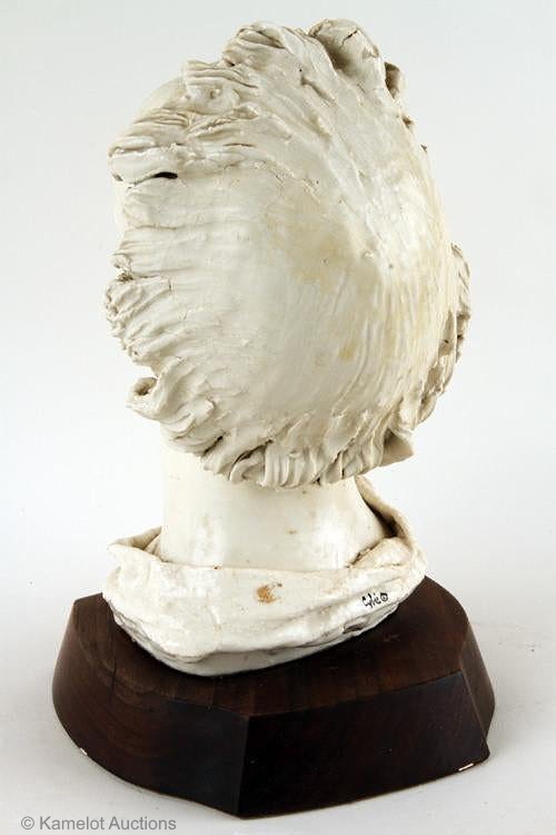 The earliest known Cybis depiction of a saint is this one, which Cybis in Retrospect cited as Head of Saint John from 1948, thirteen inches high and an “experimental one of a kind sculpture in glazed porcelain.” The black signature is not original to the bust. It was added during the 1990s or 2000s by the Chorlton studio.