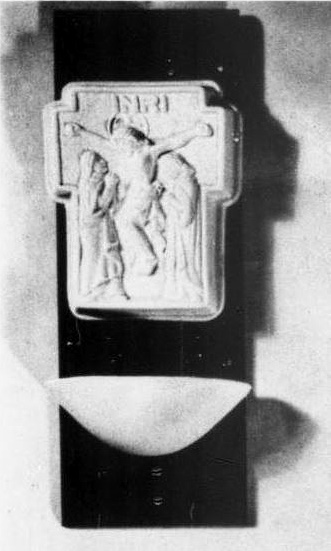 This fourth font, which was mentioned in their 1973 catalog text list, is the Holy Water Font ‘Crucifixion.’ Notice the different basin which appears slightly smaller than the other three designs.