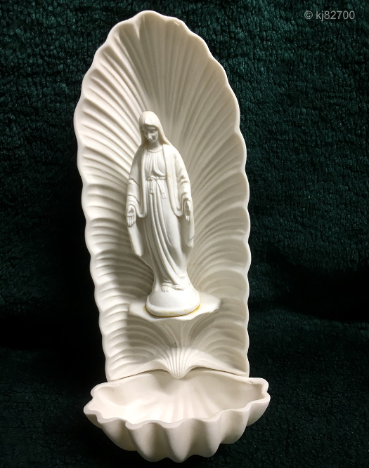 A entirely different design was used for the Holy Water Font ‘Our Lady of Grace’ which is clearly all porcelain. It’s also smaller, being 9″ high overall. The madonna figure itself is about 4.25″ high and was also sold separately as Our Lady of Grace. The white bisque version of this font sold for $10 during the 1950s.