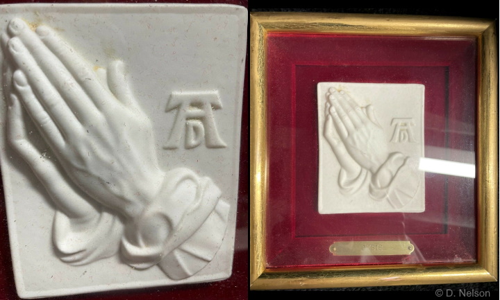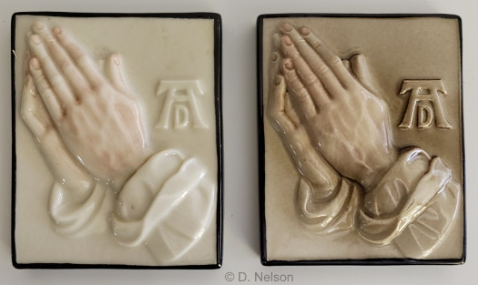 The Oremus Hands plaque is a reproduction of the famous 16th-century Albrecht Durer pencil drawing. The Cybis studio used molds that were purchased from two different mold companies for this item, which was made in two sizes and three known finishes: white bisque, color, and ‘Cypia‘. Here is the larger/standard size plaque which is 4.75″ wide x 6″ high. Cybis assigned design #2084 to this size. It does not have the AD monogram in the mold, and the mold’s manufacturer is unknown. This would be considered a Cypia (sepia) colorway.