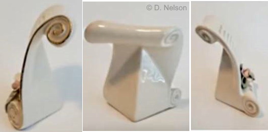 Here is the #242 version of the Prayer Book attached to a vase instead of to the typical rear support. It’s not known if this was a retail production item or just one of the Cybis artists experimenting with it, but logic dictates that it be herewith dubbed the Prayer Book/Vase. Because of the vase/stand component it is deeper (5″ front to back) than the standard Prayer Book; the top of the vase is 1″ x 3.5″.