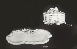 These two items appear in a very small scan of a page from a mid-1950s Cybis salesmans book. They are listed as the Rosary Box, Oval (4.5” x 3”, design #707, wholesaling for $2.50) and the Rosary Tray (7.5” x 3.5”, design #708, wholesaling for $1.75.) Assume that the retail pricing was double those numbers. A round rosary box was also available, although no photo.