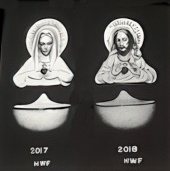 These two small placques are on the mid-1950s sales listing as Sacred Heart of Jesus Plaque (design 2017) and Sacred Heart of Mary Plaque (design 2018.) Both are 5” x 4” and wholesaled for $1.50. In the way-too-small second photo they are paired with a Holy Water Font receptacle (4.5” x 3”) which was an additional $1 wholesale. It is unusual to see the appellation “Sacred Heart” applied to Mary, because “Immaculate Heart” is typically used in her case.