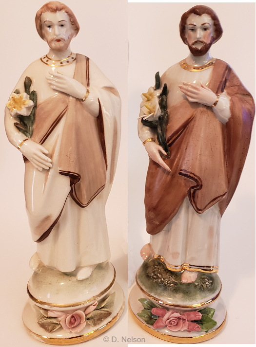 This Saint Joseph is 9″ tall; the two examples differ only in paint color/decoration.