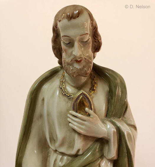 Here is Saint Jude who at 15″ is the tallest Cybis saint discovered thus far. He differs from most representations of this saint in that the medallion around his neck is plain rather than having an image of the face of Jesus on it.