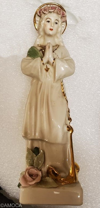 The Cybis studio once identified an example of this piece as Saint Philomena, Patroness of the Sea. She is depicted with the customary anchor, arrows, and a palm frond which in Catholic theology indicates that she was a martyr. She is about 8″ high.