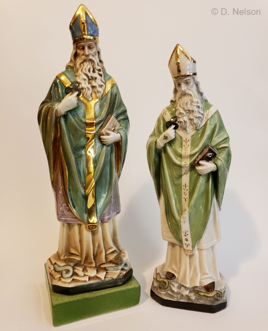 Here is a dark green Saint Patrick that is not on a base, but it’s not known if he is marked with a design number, nor what it was.
