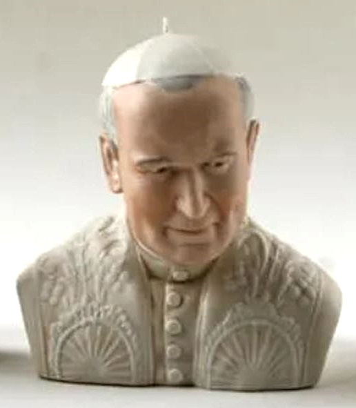 This photo shows one of the 14″ Pope busts being presented. The Cybis caption reads Theresa and Joseph Chorlton (CEO of Cybis) present Pope John Paul II with a commemorative anniversary bust at the Vatican. Although this is the only Cybis portrait of an actual Pope, the studio has personally presented other sculptures to two other Popes as well. A one of a kind enthroned Saint Peter was presented to Pope Paul VI in 1964, and Moses ‘The Great Lawgiver’ was presented to Pope John XXIII.