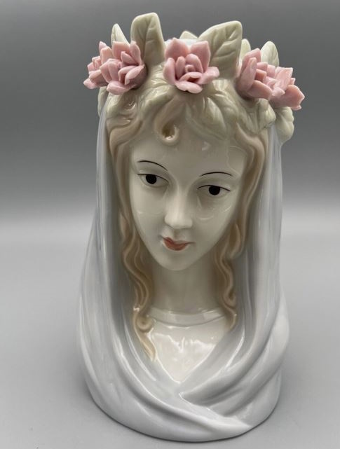 This is a slightly different case: Was Lefton knocking off the Holland Mold Company (the original creator of this madonna bust mold), or Cybis (who chose to decorate their version with a lace trimmed veil and central floral), or both? The mold itself was sold by Holland to anyone who had a few dollars to spend, so it was fine for Lefton to use it (if they paid for it, which I rather doubt.) However, the choice of decoration approach was clearly lifted from one of the Cybis versions. That said, Lefton did add hair to theirs. The Cybis studio did three iterations of this mold with the lace trim added: in the 1950s (those were glazed), as white bisque in 1960, and finally a color bisque version in 1992. This was Cybis design number 202, indicating that it was one of their very first religious issues. There are several known Lefton product/item numbers for this piece, such as KW3042, KW3043 and KW3207. All of them look exactly like the one shown above, however. Lefton numbers starting with KW indicate that the item was a Kowa Toki, Japan factory piece made between 1953 and 1971.