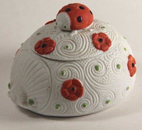 And here is the knockoff of the Cybis Ladybug ‘Duchess of Seven Rosettes’. Because Lefton wanted to make it into a trinket box, they added a small ladybug at the top to serve as the ‘handle’; no need to do that with the Cybis turtle because The Baron already had a frog as a rider! Lefton also eliminated the Duchess’ antennae and feet as extraneous. Both Lefton pieces were made in Taiwan, which dates them to the 1980s; but they did not get the typical Lefton red-and-gold sticker. Instead, the copies I have seen only have a plain, narrow gold foil strip saying Taiwan. They do have the normal Lefton stamp and item number, however.