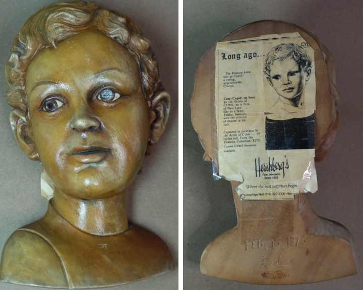 Although this is not a direct-from-mold copy, it is close enough to show clear intent. This 1976 offshore knockoff in what looks like wood(?) definitely fooled someone more than once, because the Etsy seller who offered this described it as an “antique art deco era cybis porcelain” – none of which is true. It looks as if the Hershberg’s newspaper ad for an actual Cybis Eros has been taped to it for a while, and I will give the Etsy seller the benefit of the doubt and assume he/she acquired it that way. However, there’s no excuse for describing a a dated 1976 item as being “antique art deco” and it’s also clear that the material is not porcelain!