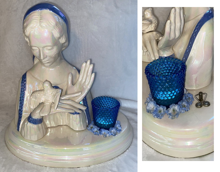 Here’s another copy which does have the bird but here Mary appears as a peasant woman: I’ve never seen a madonna depicted wearing a headscarf! Multiple further tweaks include smoothing out her hair and an entirely new shirt and shawl/jacket. Not only are her hands in different positions but the right (bird-perch) one has the fingers in a different orientation as well. The seller’s description gives its height at 6.75″ which is considerably smaller than the original’s 11″, even accounting for the base upon which the Cybis one sits. The only discernable mark on the underside is a stamped 6355. It’s too bad there’s no way to date this example; is it possible that this could have been the original inspiration for the Cybis piece?? It’s a known fact that quite a few Cybis pieces were either close adaptations or outright copies of pieces found elsewhere. It does seem odd that any company would go to quite as much trouble to not only change but downsize a knockoff of a Cybis piece. I suspect that there are secrets yet to be discovered about the history of this particular mold, especially since it appears to have been made in at least two colorways (the wood base under the pink one was a seller’s prop.)