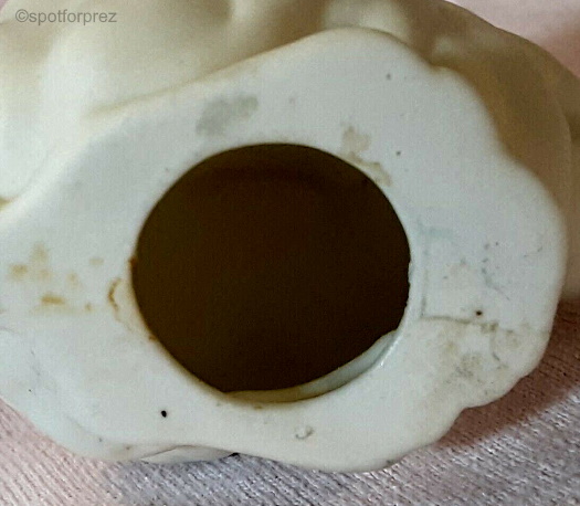 It’s a shame that the only identifying mark is the made-in-Taiwan sticker, because I am now morbidly curious as to what company went to such lengths to manufacture the reproduction mold so precisely. It’s obvious that they had an actual Cybis piece to start from, and I’m wondering whether a scanner and 3-D printer were involved in the mold-making process. Many thanks to Benji Parker of B&D Vintage Goods for bringing this reproduction to my attention!