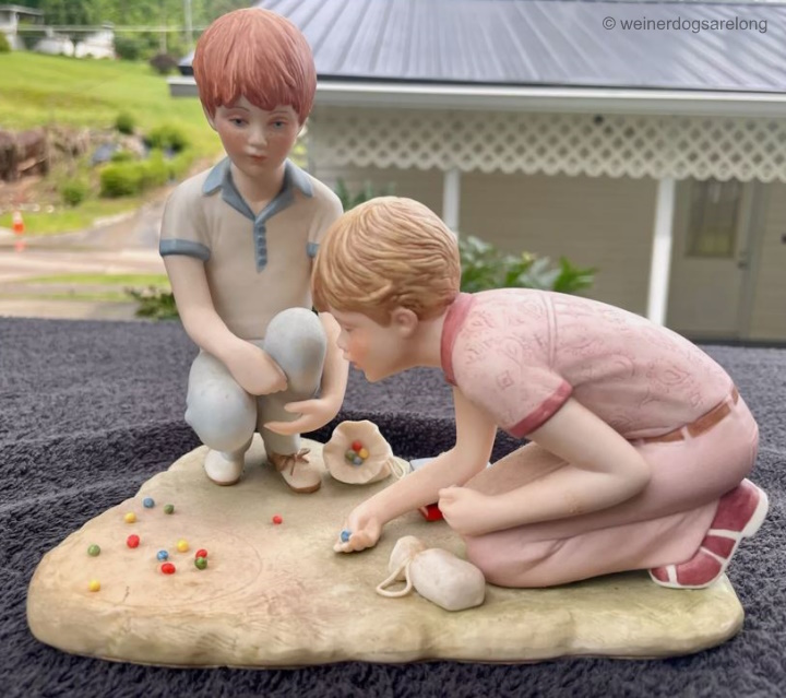This unsigned ceramic was a clear attempt to copy the 1977 Cybis piece Rusty and Jonny (Playing Marbles). I have seen more than one of these appear for sale on the internet, which means that they were made by either a prolific hobbyist or a company that only used a sticker to identify themselves by brand.