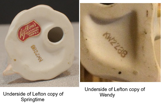 Both of these knockoffs are clearly identifiable as Lefton products. The Springtime knockoff still has its original sticker that was used between 1953 and 1971. (The real Cybis Springtime was produced between 1963 and 1969.) The Wendy knockoff no longer has its sticker but it has the stamped item number: KW2288, which is the same as on the phony Springtime. Why? Because when Lefton made something to be sold as a pair, set, or other ‘associated’ group, they gave both/all of those designs the same product number. Thus, we know that Lefton sold these as a pair or at least as companion pieces. The KW in the Lefton stamp indicates that these were made in the Kowa Toki factory in Japan. Cybis first produced Wendy in 1957 and continued to keep her in the line until the 1980s. Thus, the Cybis Wendy and the Cybis Springtime were ripe for the Lefton plucking as companion items starting in 1963, and the Lefton sticker narrows their production timeframe to between 1963 and 1971.