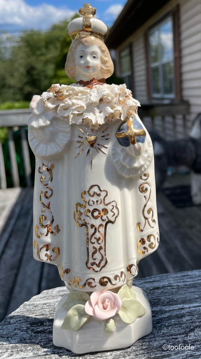 This version is about 7″ or 8″ tall and was cast from an entirely different mold. I am calling this one the Infant of Prague with Heart and Cross Motif and Lace Trim. One thing I have noticed while researching this mold is that hobbyist examples found for sale online seem to be prone to the head breaking off where the neck joins the shoulders, and this one is no exception; the brown material at the neck is oxidized glue where the head was glued back on. Many also have the two raised fingers of the figure’s right hand broken off, as this one also does. This seems to have been the nature of the beast with this particular mold. Every representation of the this iconic Catholic figure shows the child with the first three fingers of his right hand raised in a gesture of blessing; it is the accepted traditional pose. This example also has visible crazing on the front of the robe.