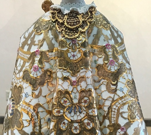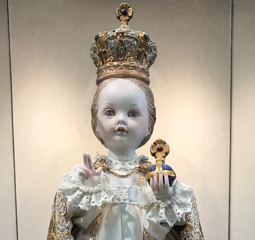 The original statue dating from the mid 1500s is 19″ high, carved from wood that was then coated with wax. The infant’s right hand is raised in a blessing gesture with two fingers raised, while his left hand holds an imperial orb. The crown is noticeably large in proportion to the head. The statue has a ‘wardrobe’ of almost 50 different robes, and has been displayed in the Discalced Carmelite Church of Our Lady Victorious (in Prague) since 1741.