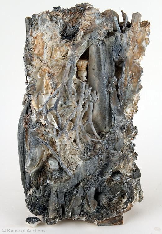 I can’t resist including this Boleslaw Cybis mixed-media oddity which — for lack of any official name — I’m calling the Infant of Prague in a Tree. I’m not sure what he was trying to convey here, but it can’t be denied that the piece in the center is the head mold from the Miniature Infant of Prague. This one of a kind piece is 14″ high. Additional views can be found in the 1940s Papka and Porcelain post.
