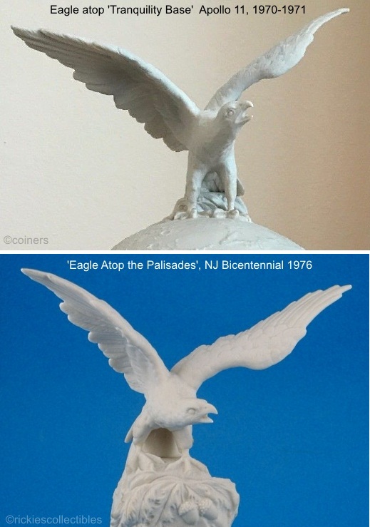 Yet another “bird snare” was the eagle originally placed atop Tranquility Base, Apollo 11 Moon Mission in 1970. It flew off to become the subject of Eagle Atop the Palisades, a special issue to commemorate the 1976 New Jersey State Bicentennial. A photo of the entire Palisades piece appears in Later Birds along with details on how this piece was later resurrected as a non-commemorative item.