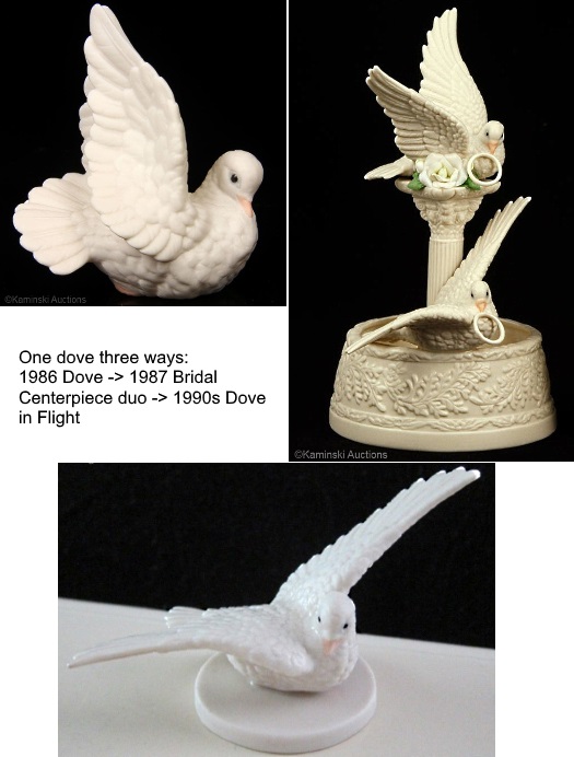 Here’s a double bird-snatching (snaring?) but with a wing twist. In 1986 Cybis introduced the Dove which has upright wings (upper photo). The following year (1987) saw the issuance of the Bridal Centerpiece in which the upper dove is the same mold but with the wings now at a 45-degree angle and a wedding ring added in his beak. The lower dove is the same mold but with the wings outspread and straightened, and the head angle very slightly changed. In the 1990s Cybis began to offer the spread-wing dove as a separate item, which in the absence of price lists I’ve dubbed the Dove in Flight. They are all the same bird which was originally designed in the mid 1980s by Lynn Klockner Brown.