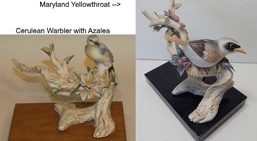 This bird was also used for one of the Western Tanagers, which likely dates from the late 1950s. The other bird mold (with open wings) is very similar to, but not exactly the same as, the one that was used for the Madonna With Bird, Blue-Gray Gnatcatchers, and USA Flower Bouquet in the early 1960s. Additional views of the Tanagers are in the Early Birds post.