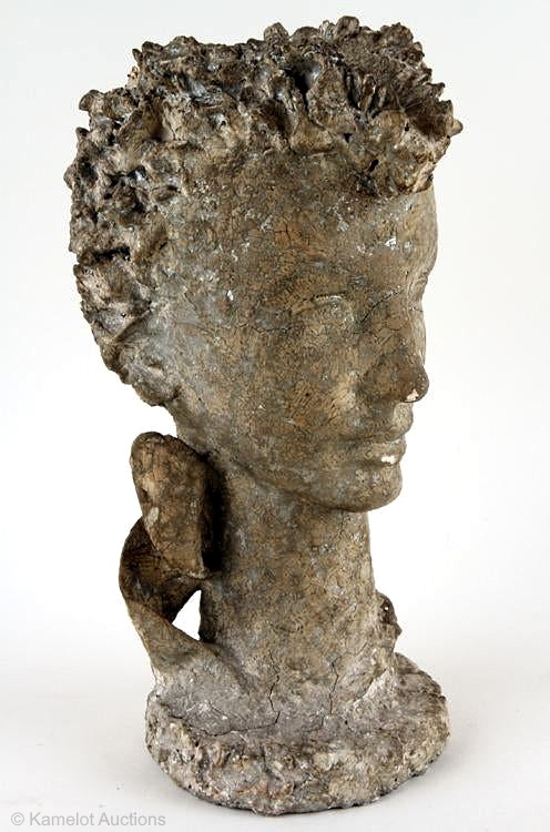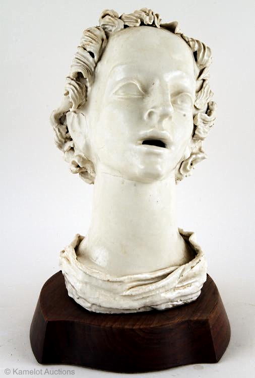This bust is titled Head with Harvest Wreath and is specifically noted as being a prototype from 1940-1942. Like the “with flowers” head, it also has the pastel ‘fresco’ painting. Both of these busts foreshadow the studio’s nascent Cordey retail line in style and feeling. The height is given as 14″ with no clarity as to whether or not that includes the wood base shown (which may only have been for photo purposes.)